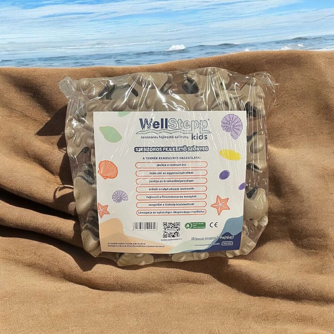 Erősítsd gyermeked talp boltozatának izomzatát a WellStepp kids tengerpartot idéző szenzoros fejlesztő szőnyege segítségével.